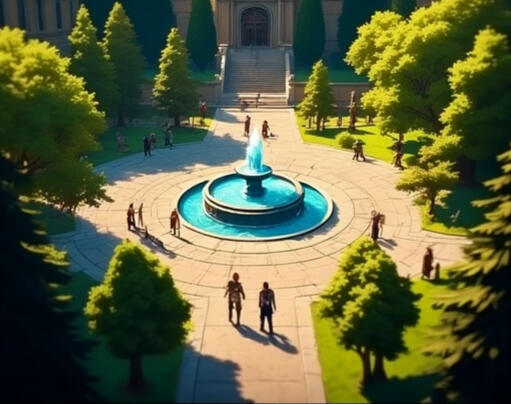 Central social hub of campus where students gather for events, performances, and seasonal celebrations. Illuminated by perpetual twilight enchantments, it is both a meeting place and cultural showcase.